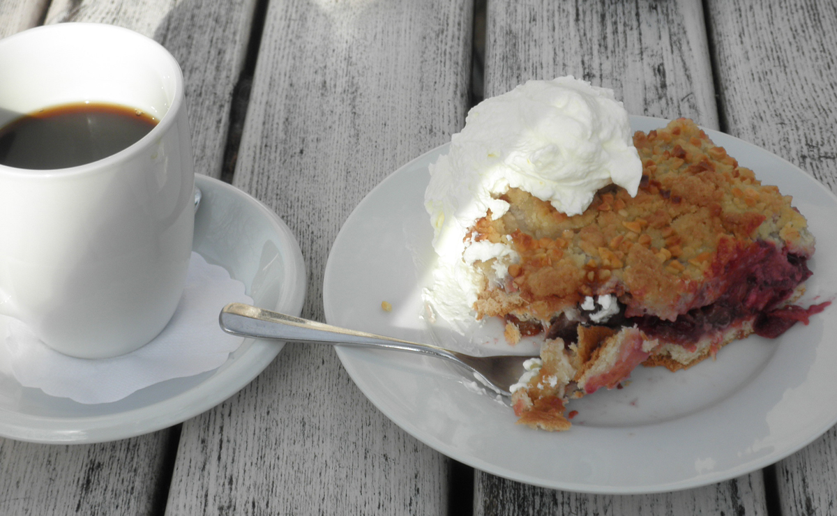 Im Fährhaus war die Terasse über Wasser noch zu und ganzes Haus ziemlich voll. Aber wir hatten Glück, im Vorgarten einen Tisch zu finden. Natürlich Kaffee und Pflaumenkuchen. Meine Freundin nahm ausnahmsweise einen Bienenstich, worauf sie sich bereut hat,,,
