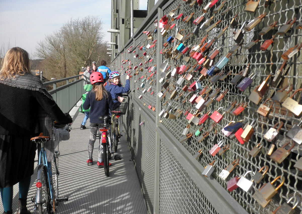 Die Caputher Fähre hat z.Zt. Instandsetzungsarbeit und fährt bis 25. März nicht. Aber kein Problem. Die Eisenbahnbrücke ist für Fußgänger und Fahrradschieber benutzbar. Wer hat mit dieser Unsitte angefangen, überall die Schlösser anzu bringen?? Ich glaube, zum ersten Mal habe ich das in Frolenz gesehen auf Ponte Vecchio. Es war schon über 30 Jahre her. Nun wird jede Brücke mit Schlösser vollgemacht. Es sieht nett aus, oder auch nicht,, Weiß jemand, ob das wirklich eine Wirkung hat?